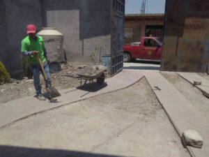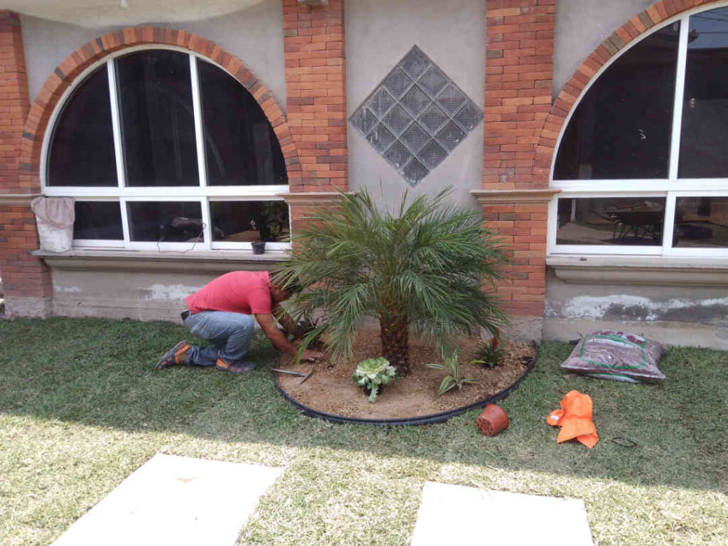 Instalación de sistema de riego, colocación de pasto kikuyo y palmeras reales en las jardineras.